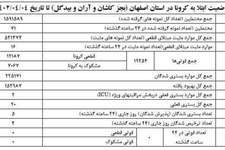 آمار وضعیت ابتلا به کرونا در استان اصفهان ( بجز کاشان و آران و بیدگل) تا روز یکشنبه مورخ ۱۴۰۲٫۰۴٫۰۴