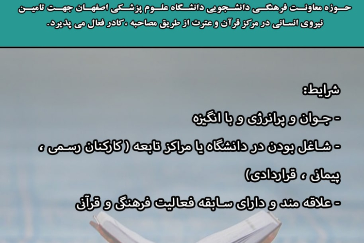 حوزه معاونت فرهنگی دانشجویی دانشگاه علوم پزشکی اصفهان جهت تامین نیروی انسانی در مرکز قرآن و عترت از طریق مصاحبه، کادر فعال می پذیرد.