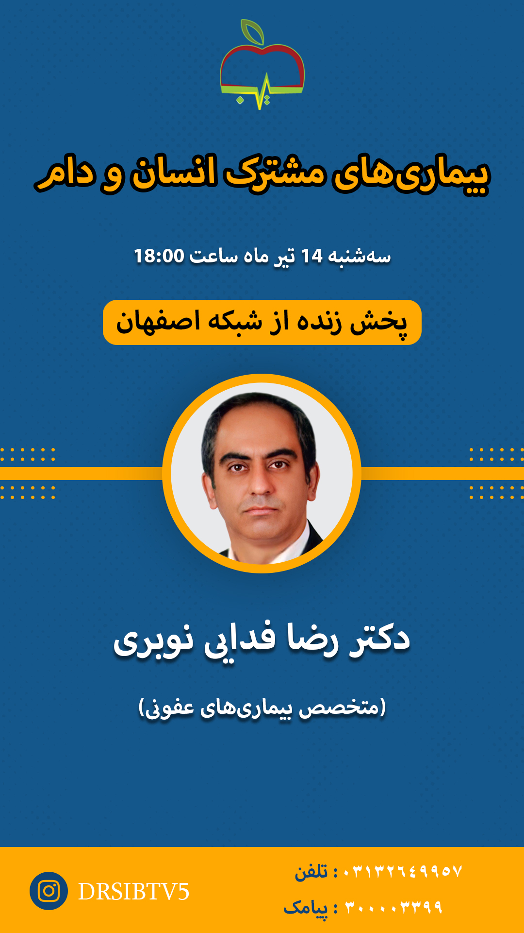 بیماریهای مشترک انسان و دام پخش زنده از شبکه اصفهان زمان:سه شنبه 14 تیرماه ساعت 18:00 (دکتر فدایی نوبری متخصص بیماریهای عفونی)