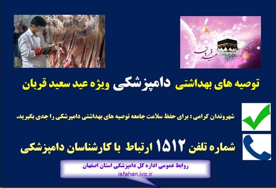 توصیه های بهداشتی اداره کل دامپزشکی استان اصفهان ویژه عید سعید قربان سال 1401 لینک مشاهده متن کامل اطلاعیه http://isfahan.ivo.ir/ZZFzo