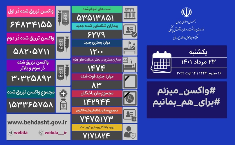 تا کنون ۶۴ میلیون و ۸۳۴ هزار و ۱۵۵ نفر دُز اول، ۵۸ میلیون و ۲۰۵ هزار و ۷۱۱ نفر دُز دوم و ۳۰ میلیون و ۳۲۵ هزار و ۸۹۲ نفر، دُز سوم و بالاتر واکسن کرونا را تزریق کرده اند و مجموع واکسن های تزریق شده در کشور به ۱۵۳ میلیون و ۳۶۵ هزار و ۷۵۸ دُز رسید.