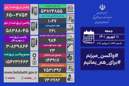 در طول ۲۴ ساعت گذشته، ۲۳ بیمار مبتلا به کووید۱۹ در کشور جان خود را از دست دادند.