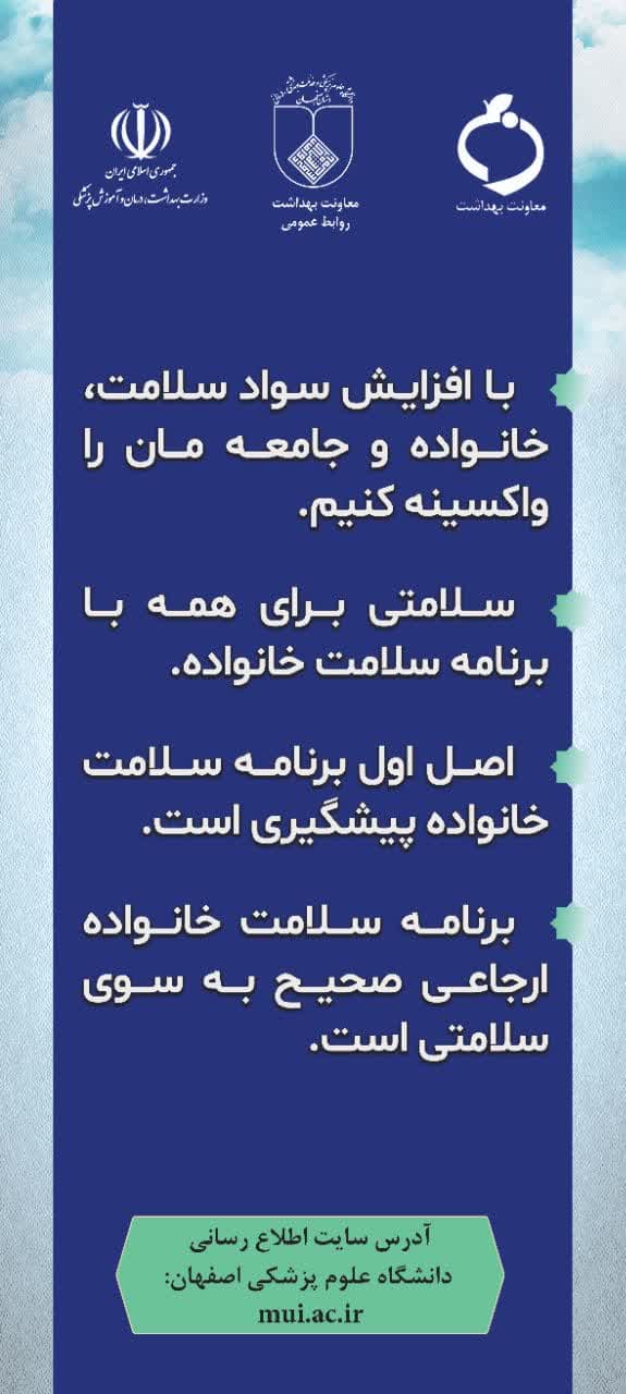 برنامه ملی سلامت خانواده و نظام ارجاع با افزایش سواد سلامت، خانواده و جامعه مان را واکسینه کنیم. سلامتی برای همه با برنامه سلامت خانواده اصل اول برنامه سلامت خانواده، پیشگیری است. برنامه سلامت خانواده ارجاعی صحیح به سوی سلامتی است.
