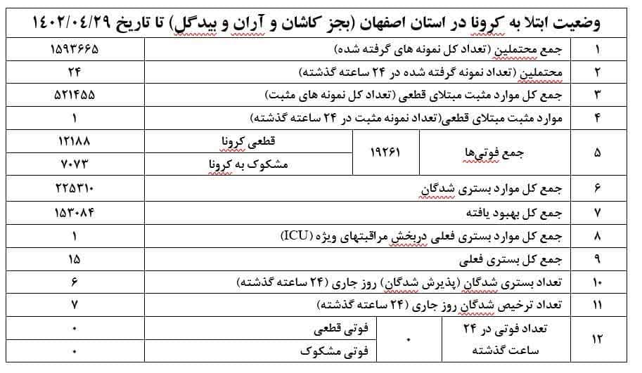 آمار وضعیت ابتلا به کرونا در استان اصفهان آمار وضعیت ابتلا به کرونا در استان اصفهان ( بجز کاشان و آران و بیدگل) تا روز پنجشنبه مورخ ۱۴۰۲٫۰۴٫۲۹