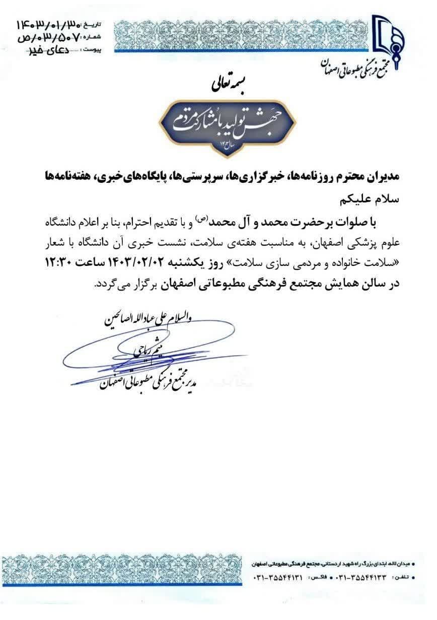 🔰 نشست خبری و مطبوعات 🗓 یکشنبه ۲ اردیبهشتماه۱۴۰۳⏰ ساعت ۱۲:۳۰📪 سالن همایش مجتمع فرهنگی مطبوعاتی اصفهان💠 مجتمع فرهنگی مطبوعاتی اصفهان