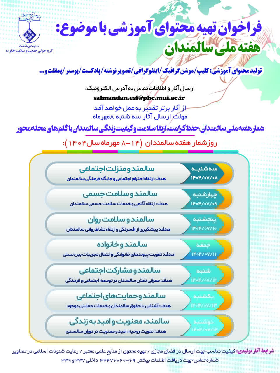 💠 فراخوان تهیه محتوای آموزشی با موضوع هفته ملی سالمندان ( ویژه پرسنل و دانشجویان دانشگاه علوم پزشکی اصفهان) 🗓 هفته ملی سالمندان 8 لغایت 14 مهرماه📢شعار هفته:حفظ کرامت، ارتقاء سلامت و کیفیت زندگی سالمندان با گام های محله محور