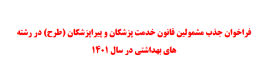 بدینوسیله به آگاهی می رساند سامانه جذب مشمولین قانون خدمت پزشکان و پیراپزشکان از تاریخ 1401/8/251 ساعت 10 صبح لغایت 1401/9/2 ساعت14 بعدازظهر به آدرس tarhreg.behdasht.gov.ir فعال می گردد. همچنین به اطلاع می رساند این مدت، به دلیل نیاز فوری به نیرو به هیچ وجه قابل تمدید نمی باشد و در صورت تامین نیرو سایت زودتر از موعد مقرر بسته می شود. یادآوری می گردد اولویت انتخاب، با متقاضیان بومی ساکن شهرستان های ذیل می باشد. همچنین پیشنهاد می گردد متقاضیانی که قبلا ثبت نام کرده اند با توجه به شهرستان محل سکونت و وضعیت بومی بودن نسبت به اصلاح محل طرح اقدام نمایند.